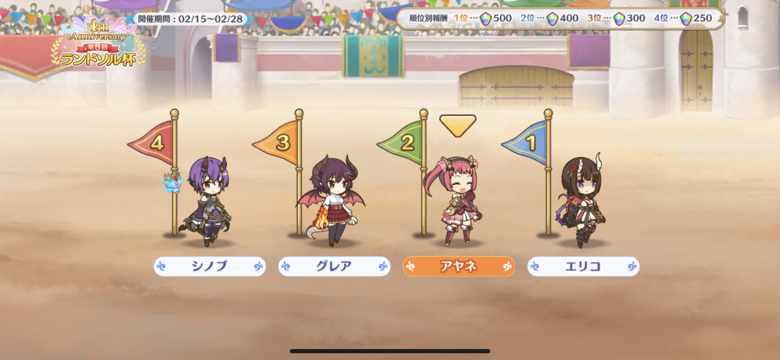 ランドソル杯6日目。 今回のランドソル杯出場者は「エリコ」「アヤネ」「グレア」「シノブ」の4名。